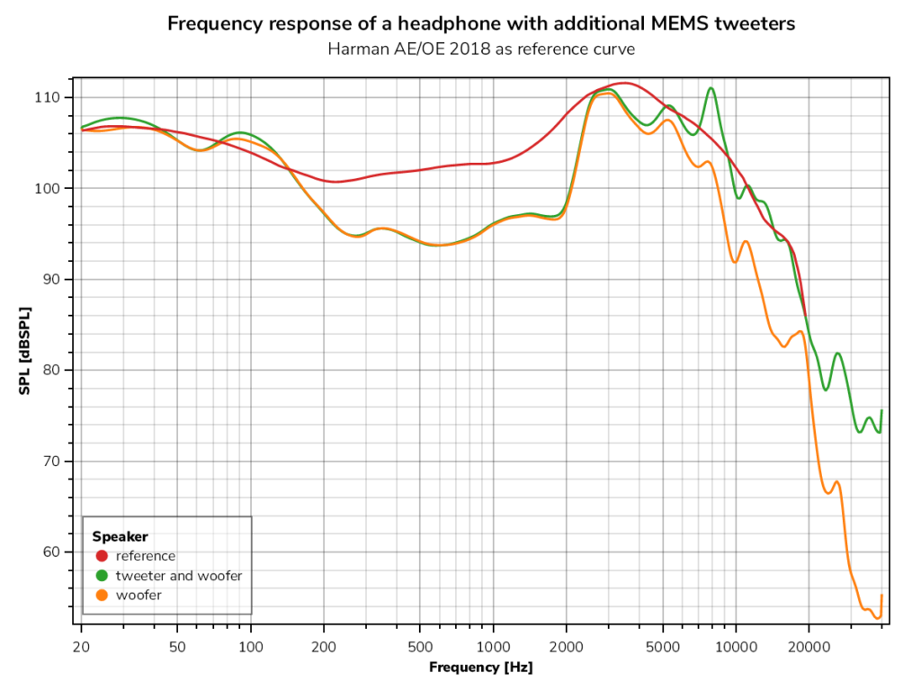 Designing a Hi-Res headphone with MEMS speakers is an exercise in finding the right balance between accuracy, output, and acoustic harmony. Throughout our development, we compared our prototypes against industry-standard reference curves, such as the Harman AE/OE target response. These curves are built on listener research and help ensure that the added energy from the MEMS tweeter integrates naturally into the overall sound signature. Aligning the system to such references helps to achieve a listening experience that feels neutral, controlled, and engaging rather than overly bright.